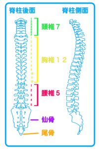 脊椎は、体幹骨の一つであり、中枢神経である脊髄を保護する役割とともに、体幹支持機能を併せ持っています。一般的には背骨とも呼ばれる脊椎ですが、頭部に近いほうから頚椎・胸椎・腰椎(及び仙骨・尾骨)と分類されています。また、脊椎は24個の椎骨によって構成されており、頚椎が7個、胸椎が12個、腰椎が5個となります(下図参照)。