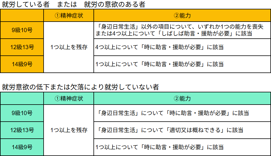 等級の認定要件について、表にまとめると次のとおりとなります。